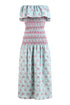 Blue and pink floral stripe cotton strapless smocked midi dress with crochet detail, unlined