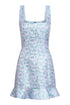 - Teal and purple daisy brocade mini dress with square neck and flounce hem, fully lined