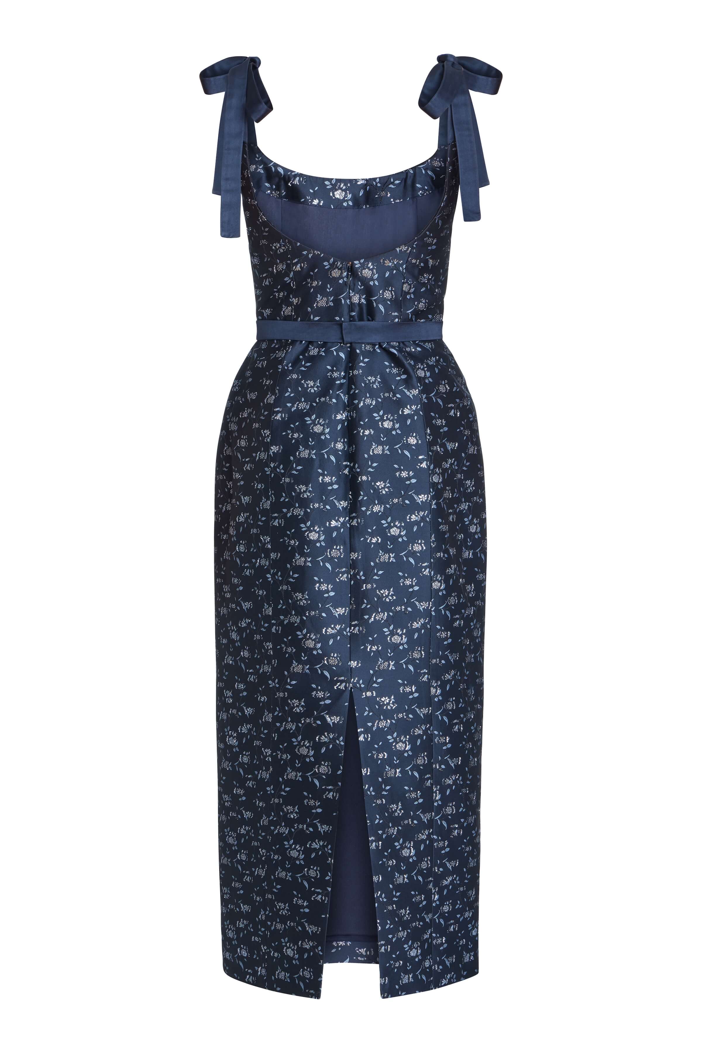 - Scoop neck corset bodice midi dress with contrast tie straps and detachable belt, fully lined with back slit