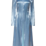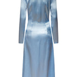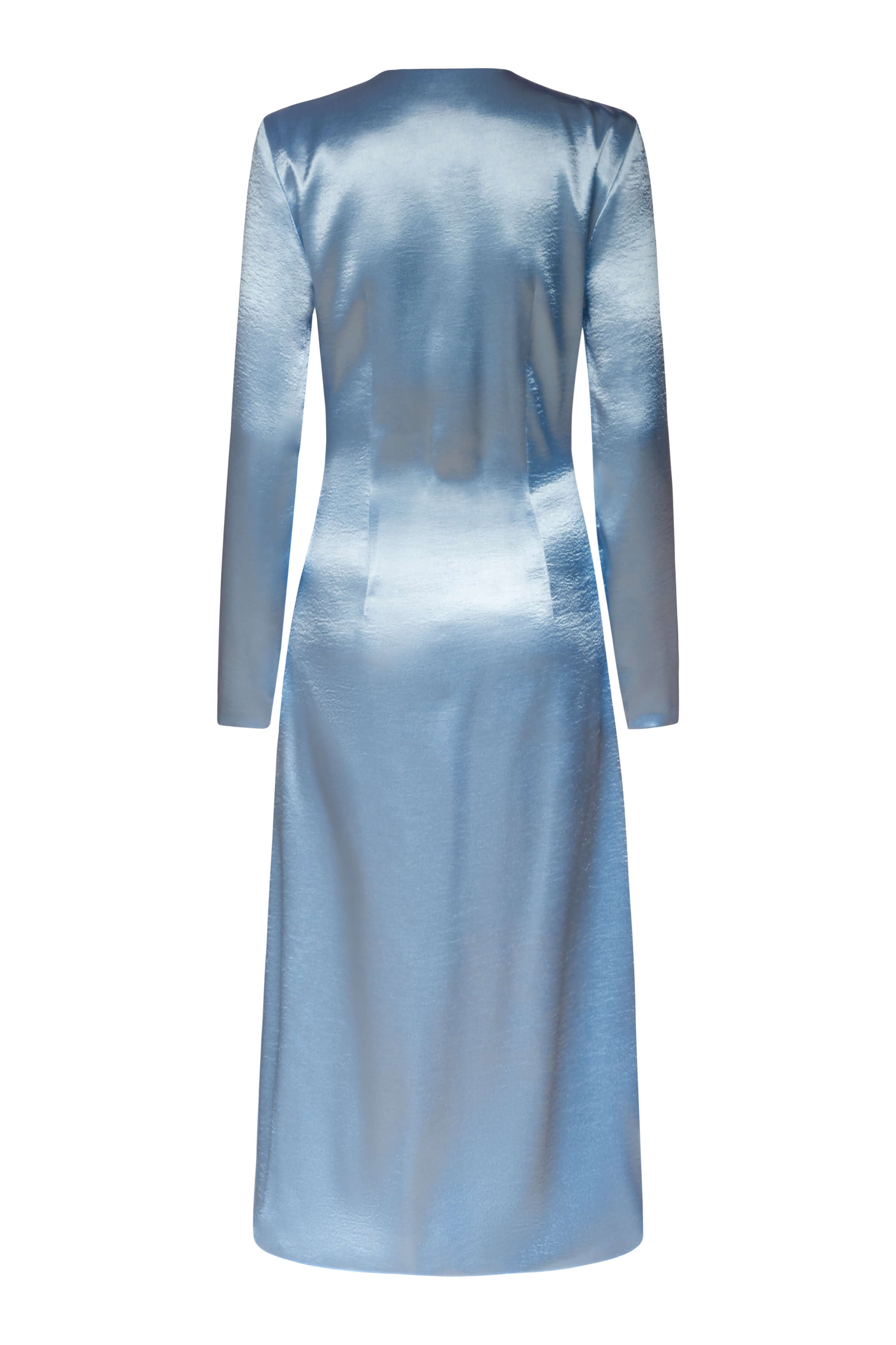 - Ice blue hammered satin long sleeve top, split button down, fully lined