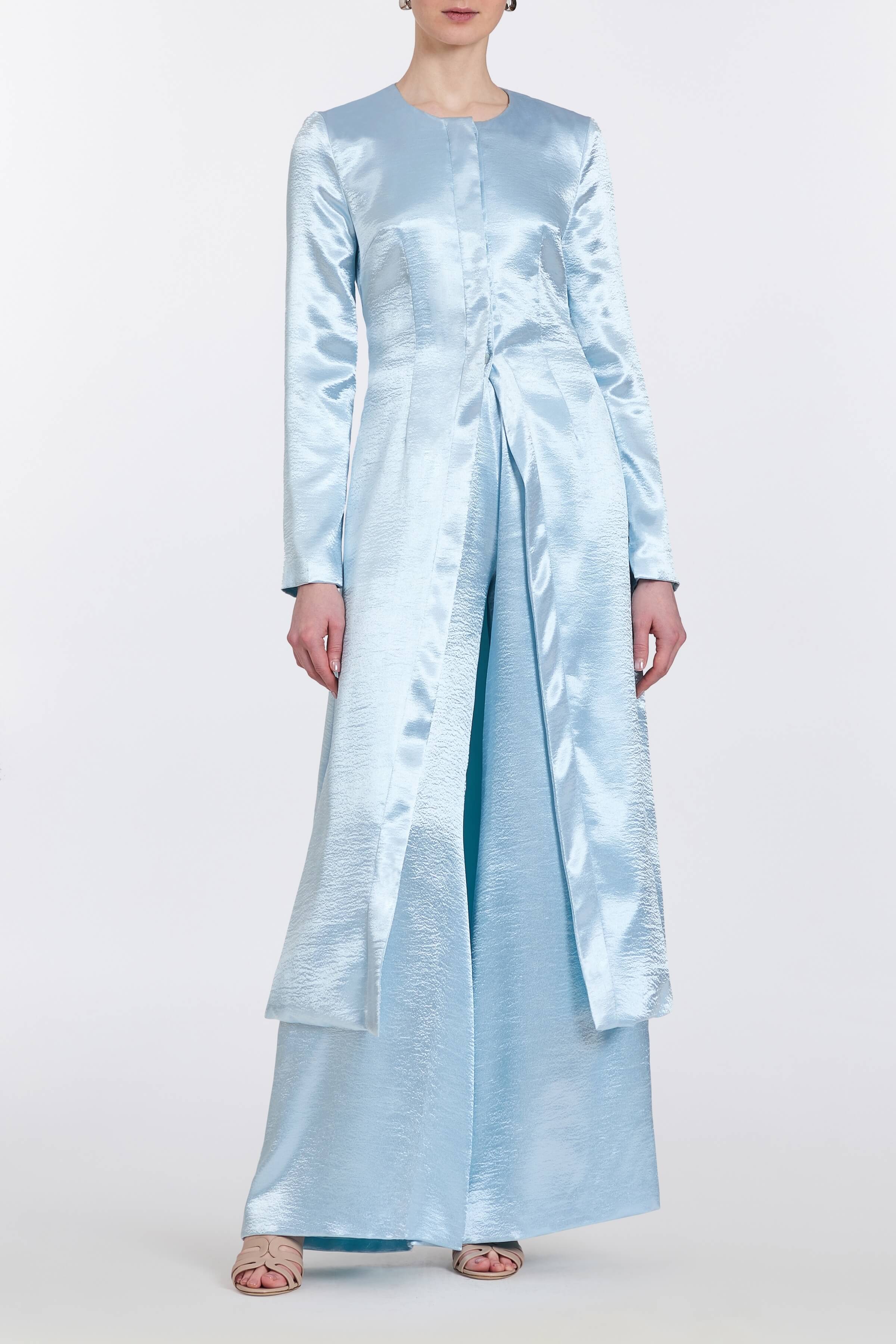 - Ice blue hammered satin pull-on pant with elastic waist band, fully lined