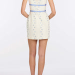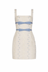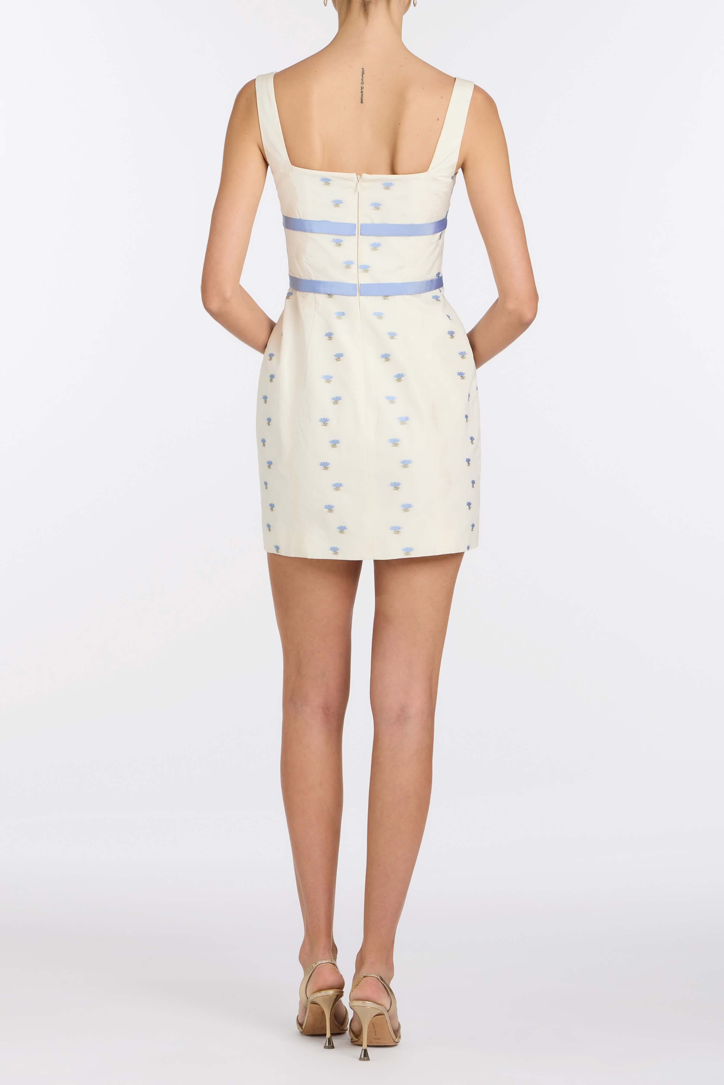 - Ivory floral striped taffeta square neck mini dress with cornflower waist bows, fully lined