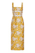 - Yellow and white floral brocade square neck column midi dress with bow band details and back slit, fully lined