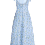 - Blue floral ikat corset a-line midi dress with belt and self-tie bow straps, fully lined