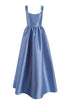 - Periwinkle mikado full skirt corset gown with scooped neckline, contoured straps, and pockets, fully lined
