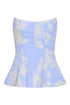• Ivory floral embroidered cornflower blue cotton scooped strapless peplum top, fully lined