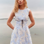 - Ivory floral embroidered cornflower blue cotton stripe round neck sleeveless mini dress with navy satin piping underbust and bow, fully lined