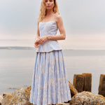 - Ivory floral embroidered cornflower blue cotton scooped strapless peplum top, fully lined