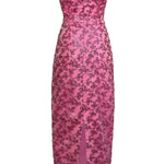 - Pink floral sequin off-the-shoulder midi corset dress with straight neckline and back slit, fully lined