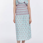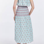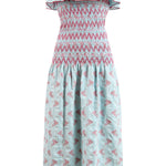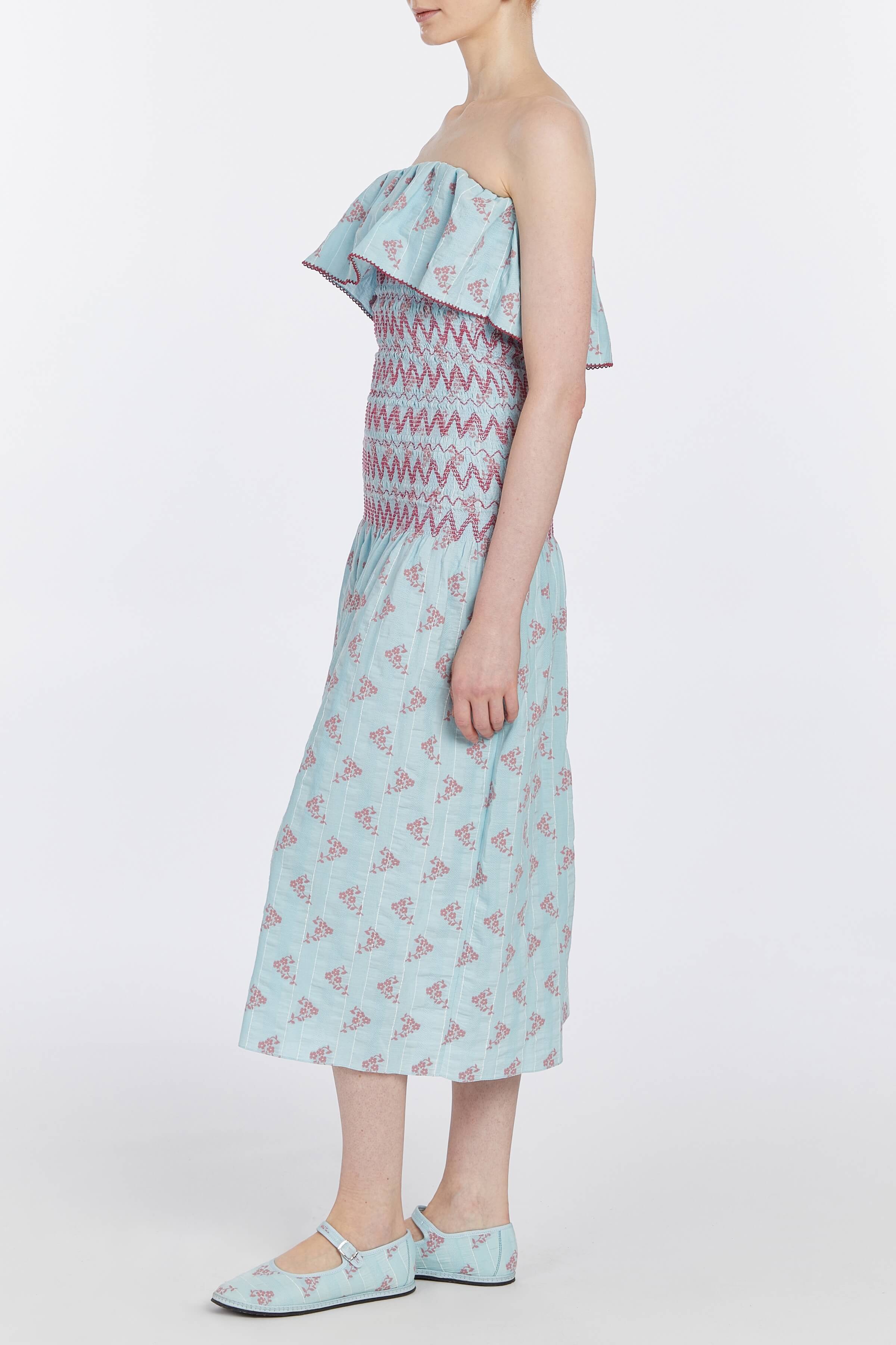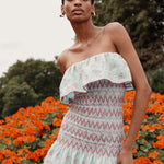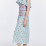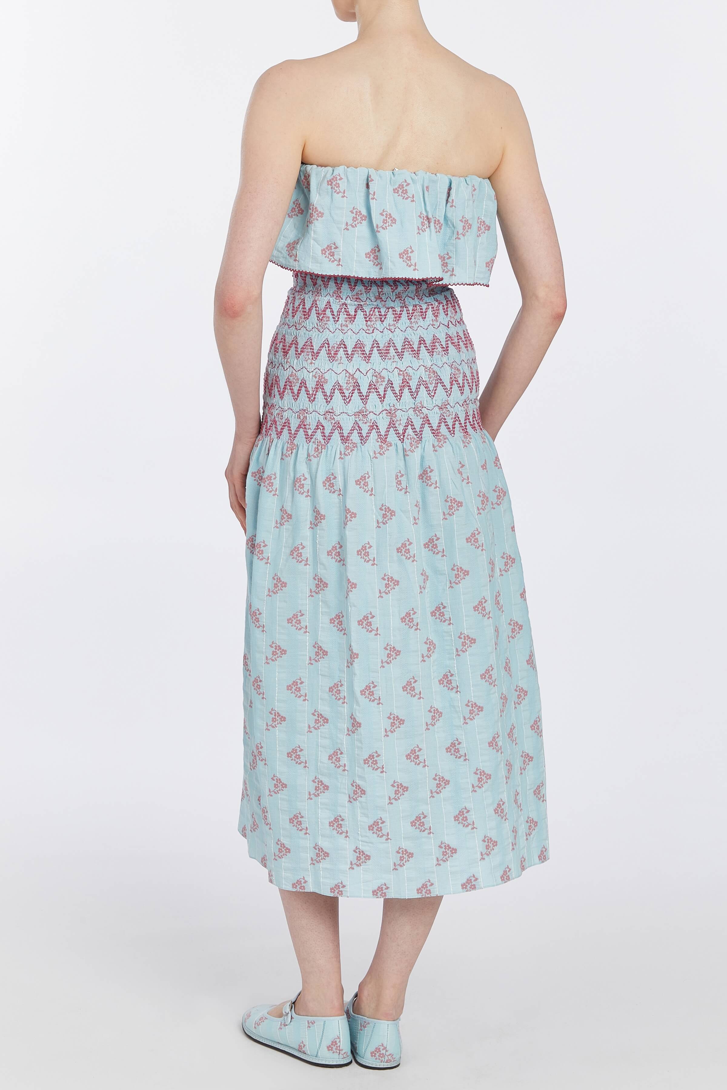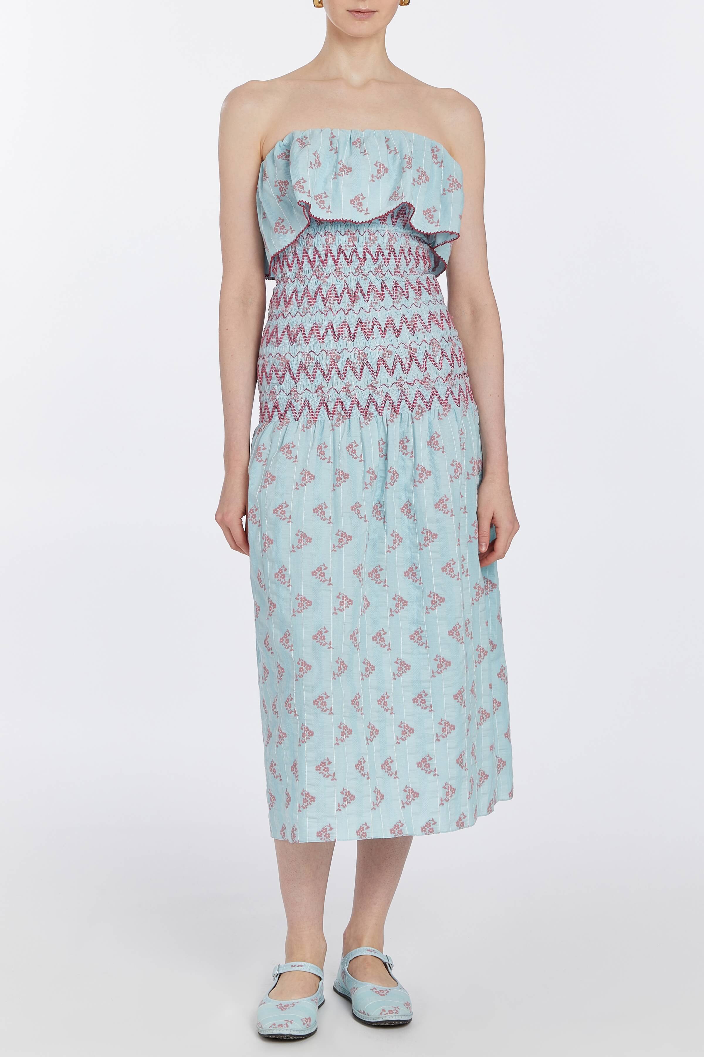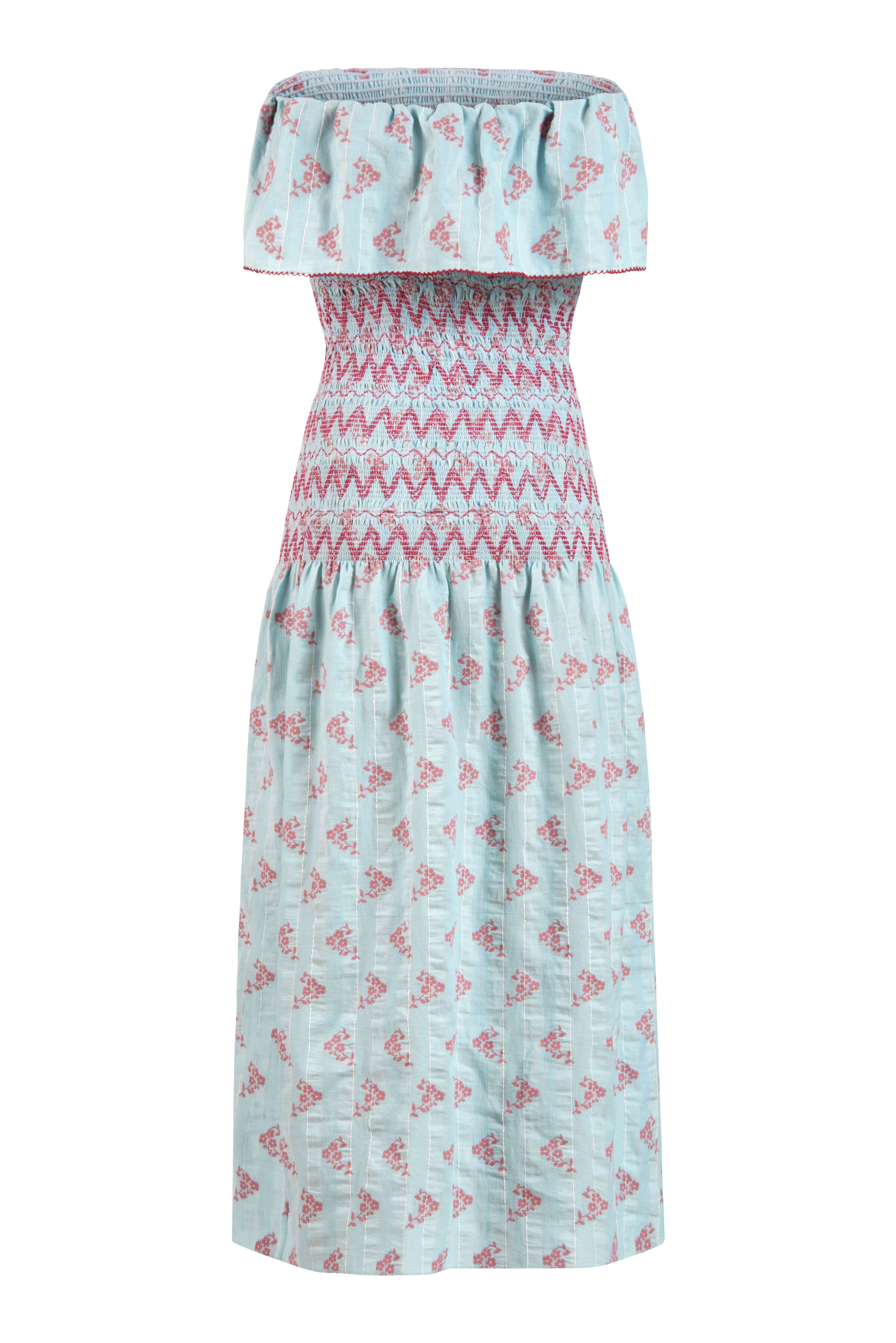Blue and pink floral stripe cotton strapless smocked midi dress with crochet detail, unlined