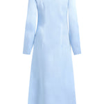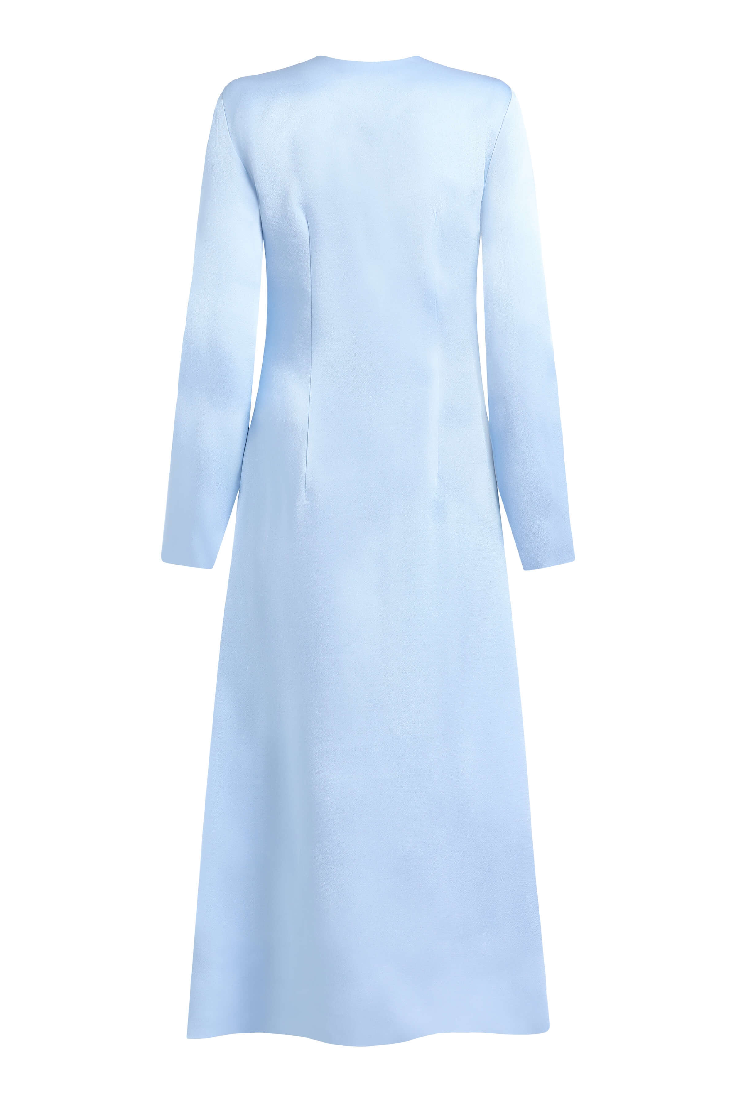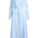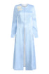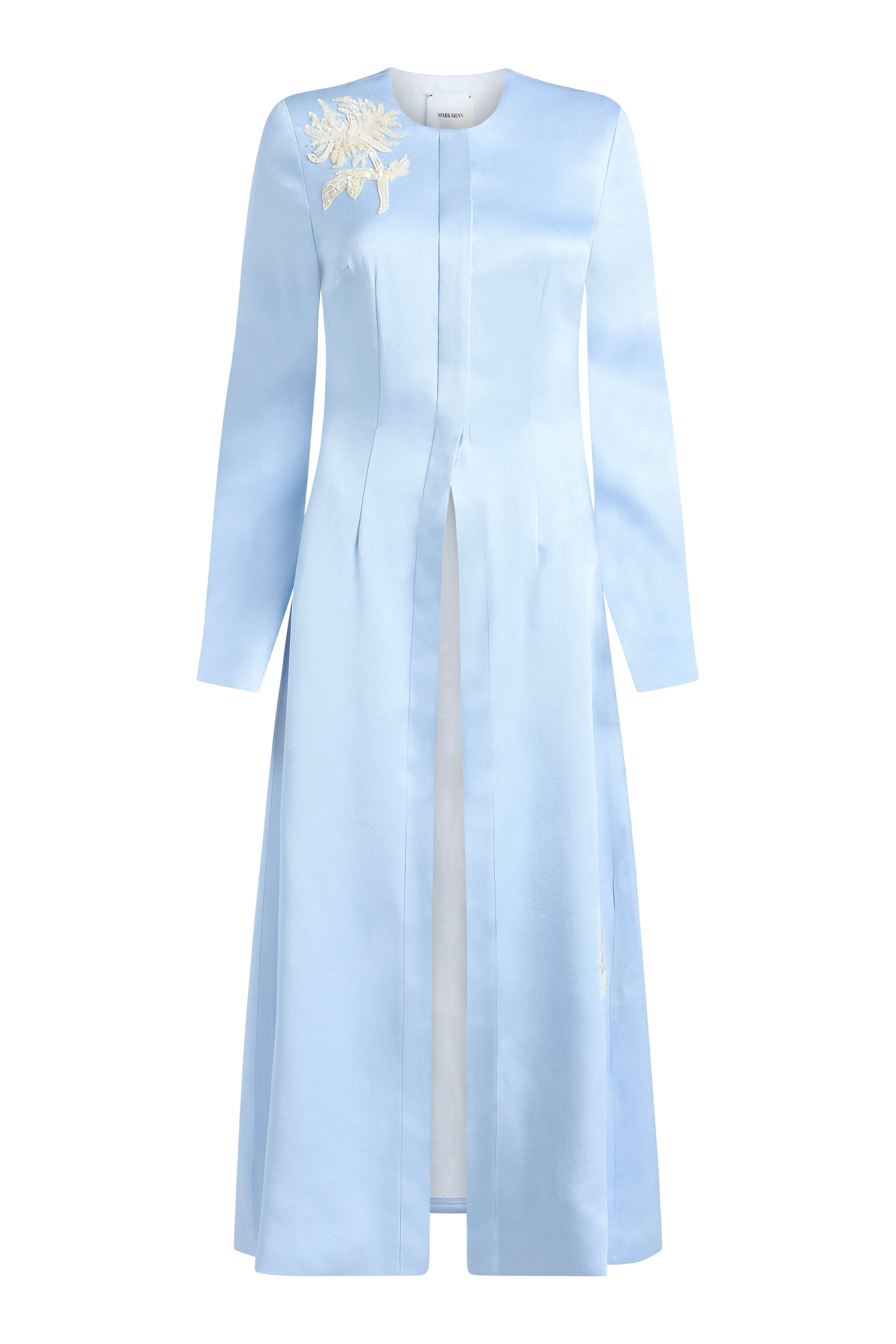 - Periwinkle crepe-back satin long sleeve split button up top featuring floral embroidered and sequined patches.