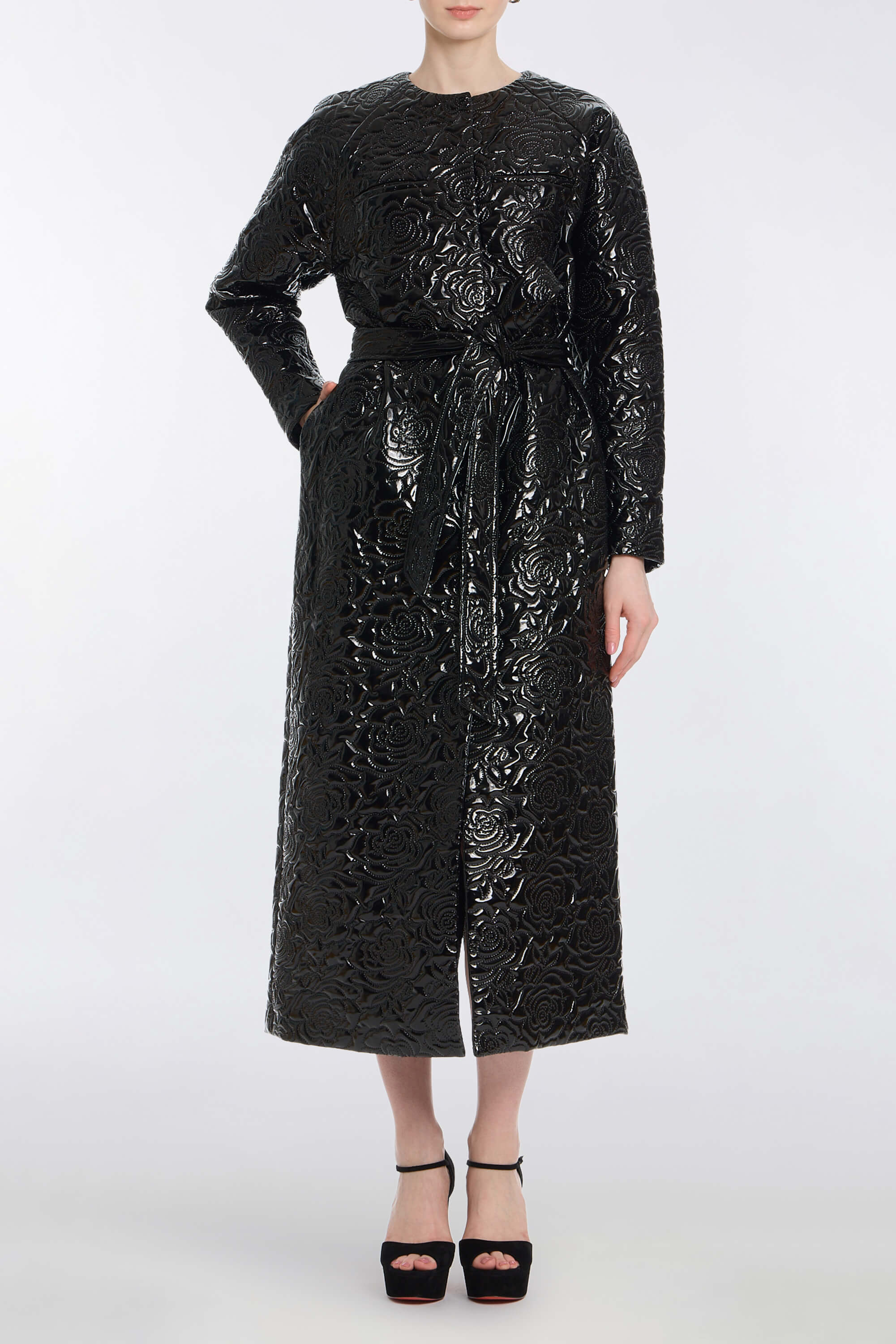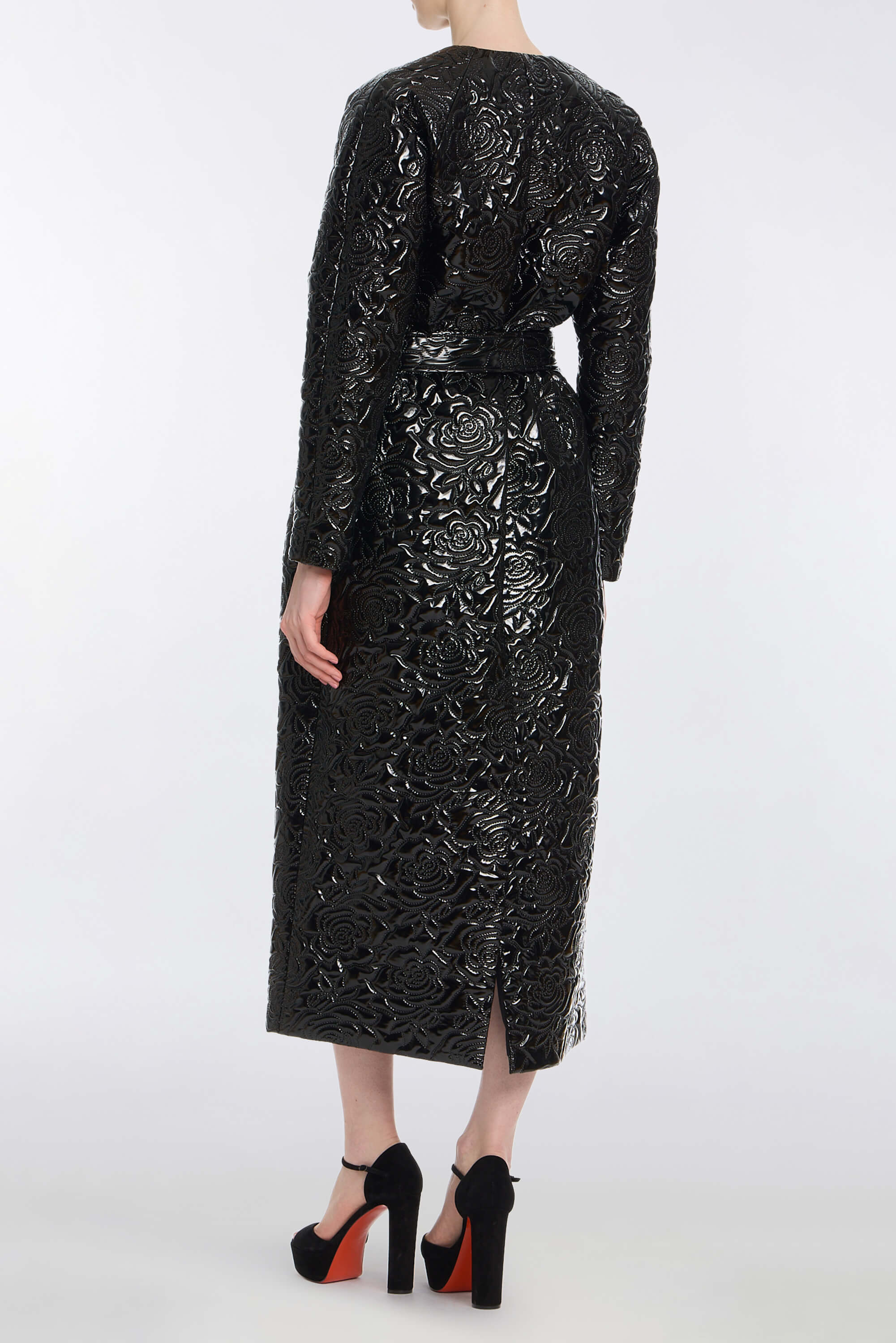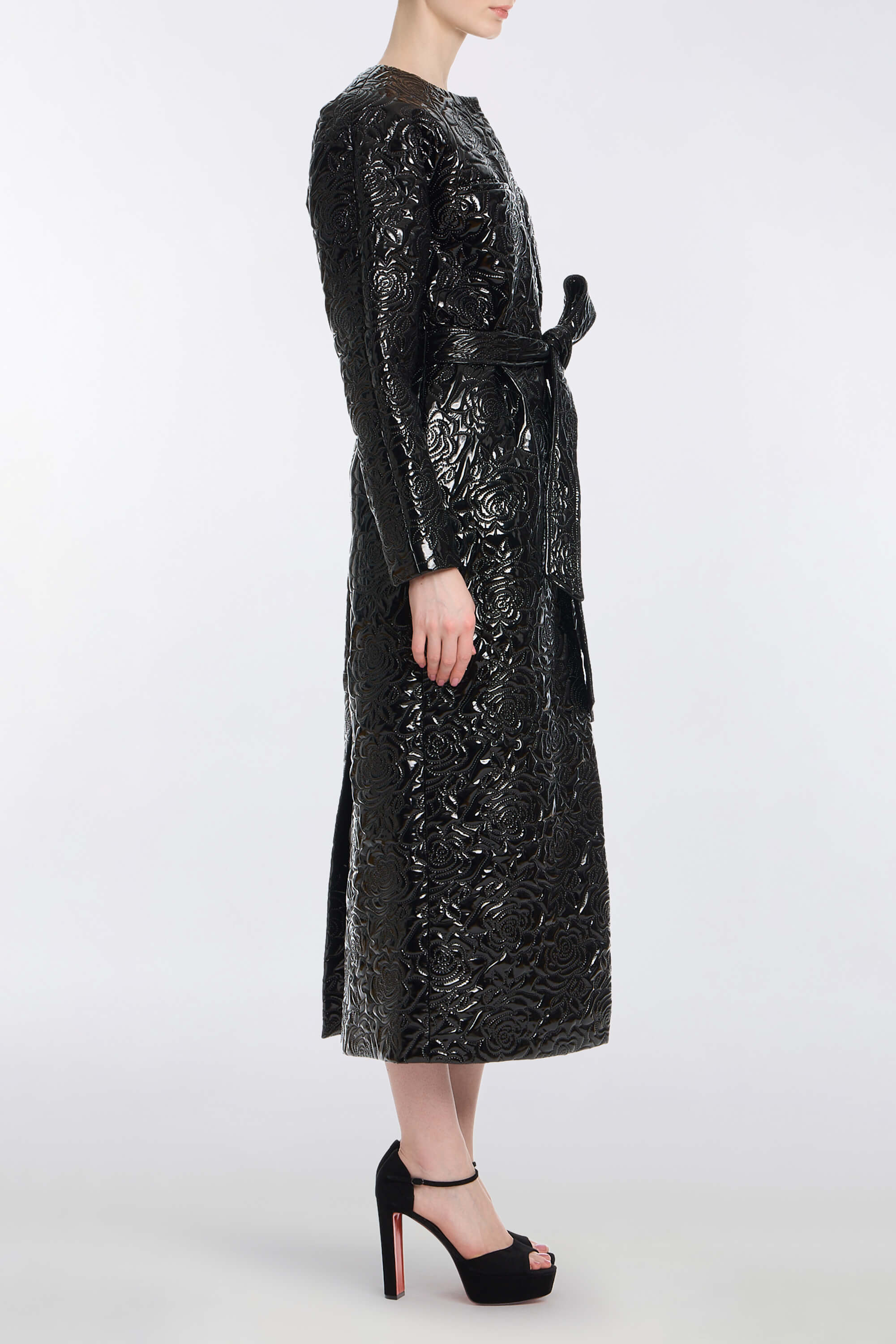 - Cocoon shape faux patent leather coat with self tie belt, fully lined