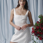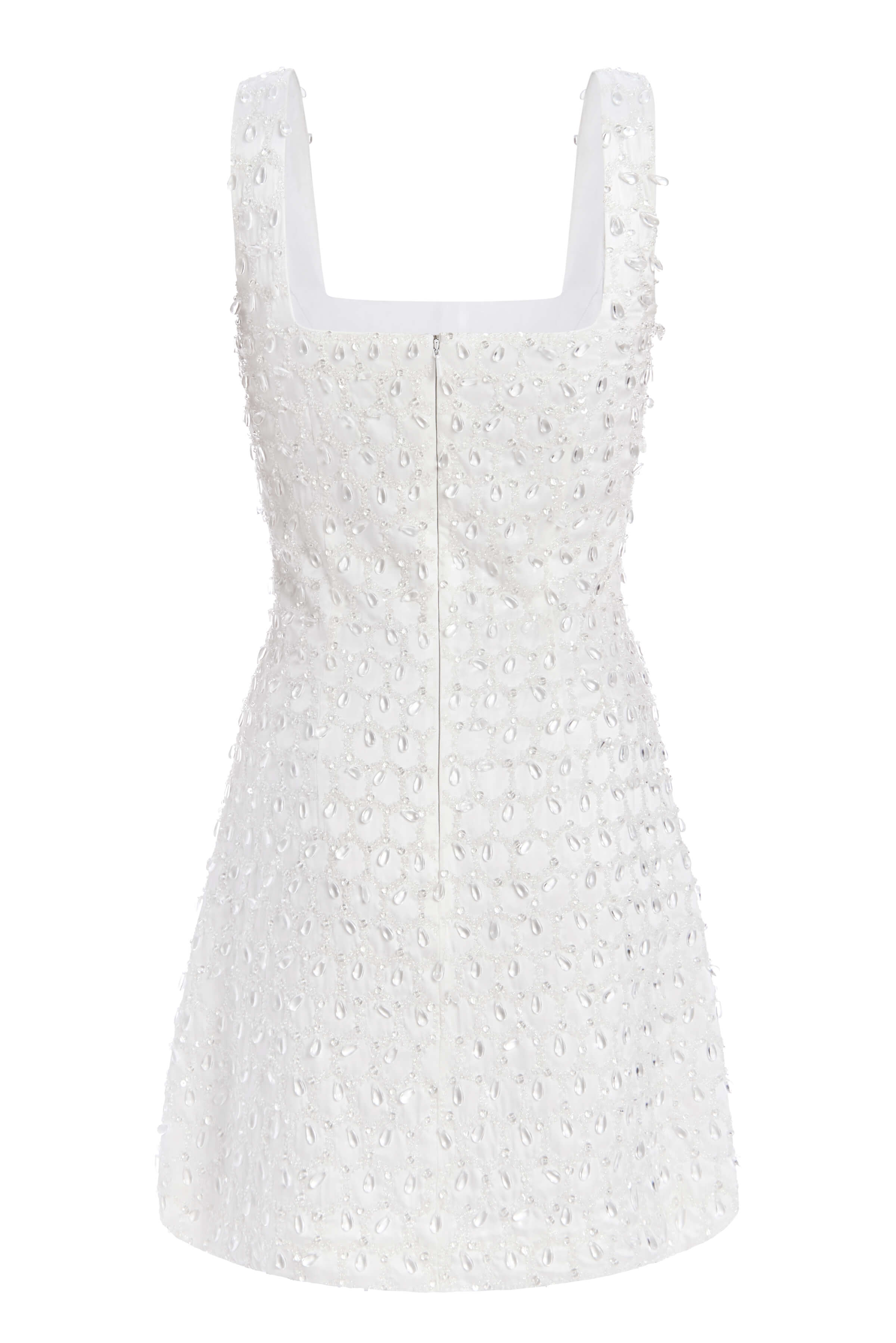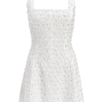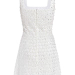 - White square neck hand-beaded mini dress with geometric sequins and water drop crystals, fully lined