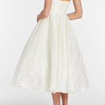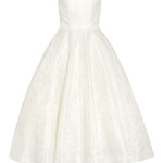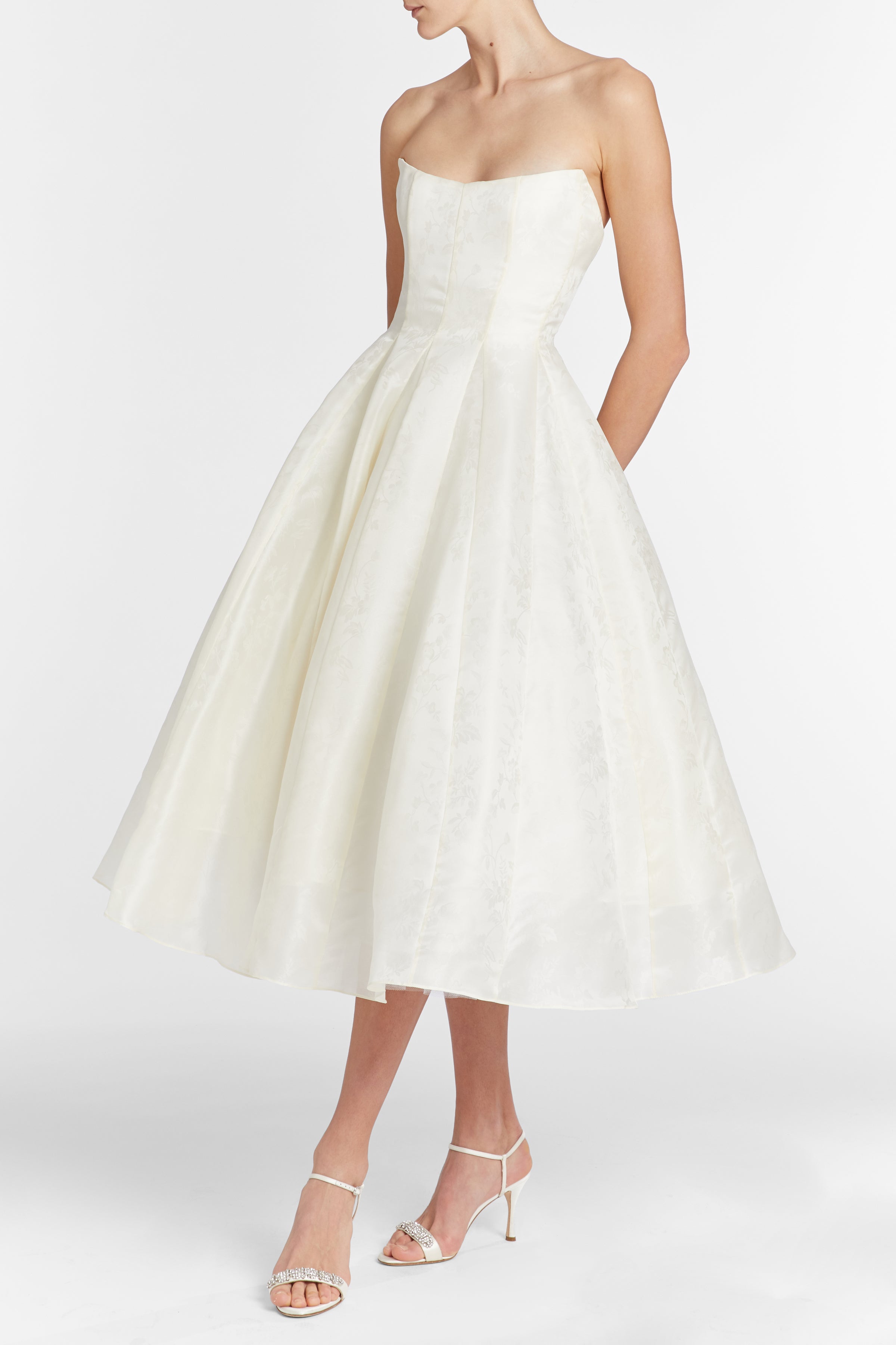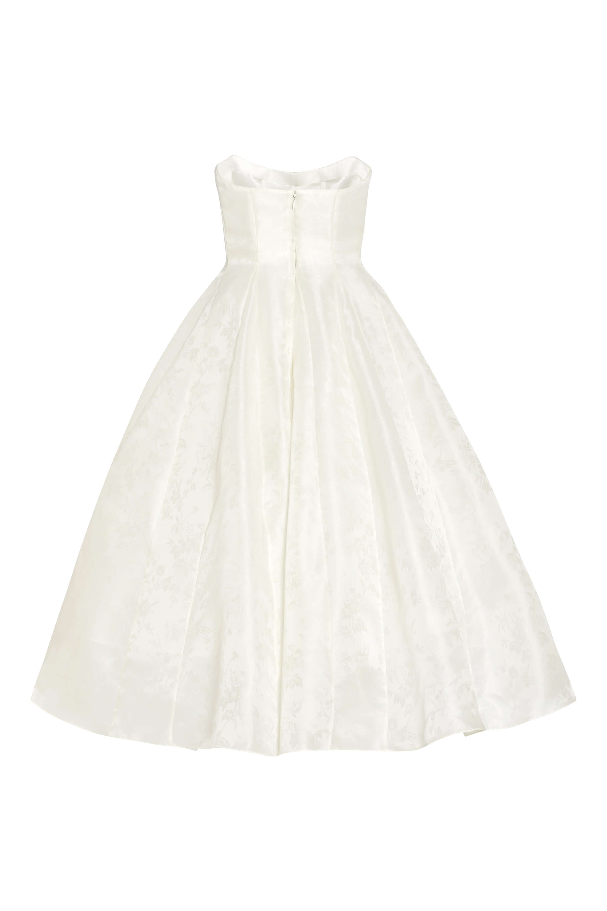 - Strapless paneled white floral jacquard dress with crinoline underlay