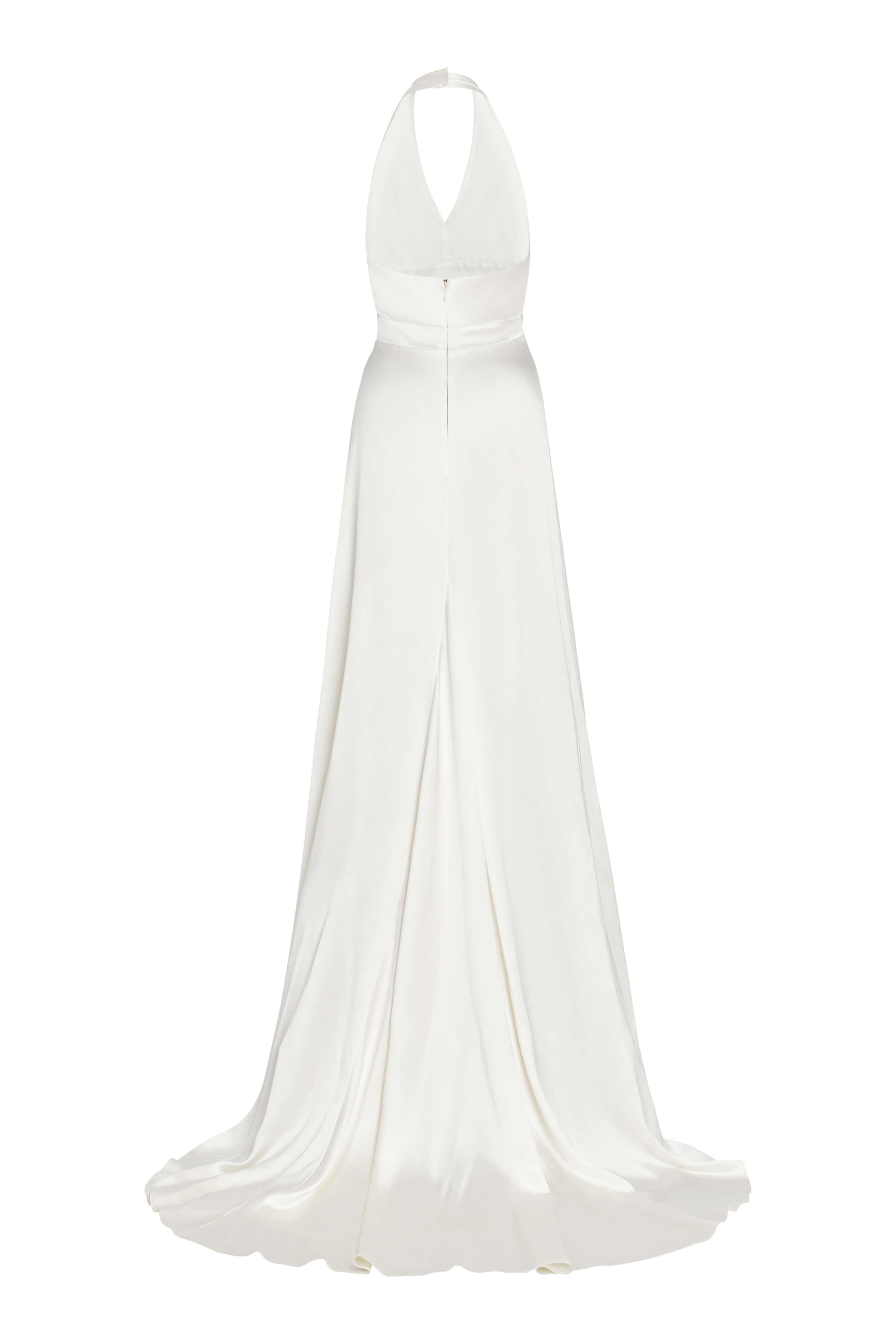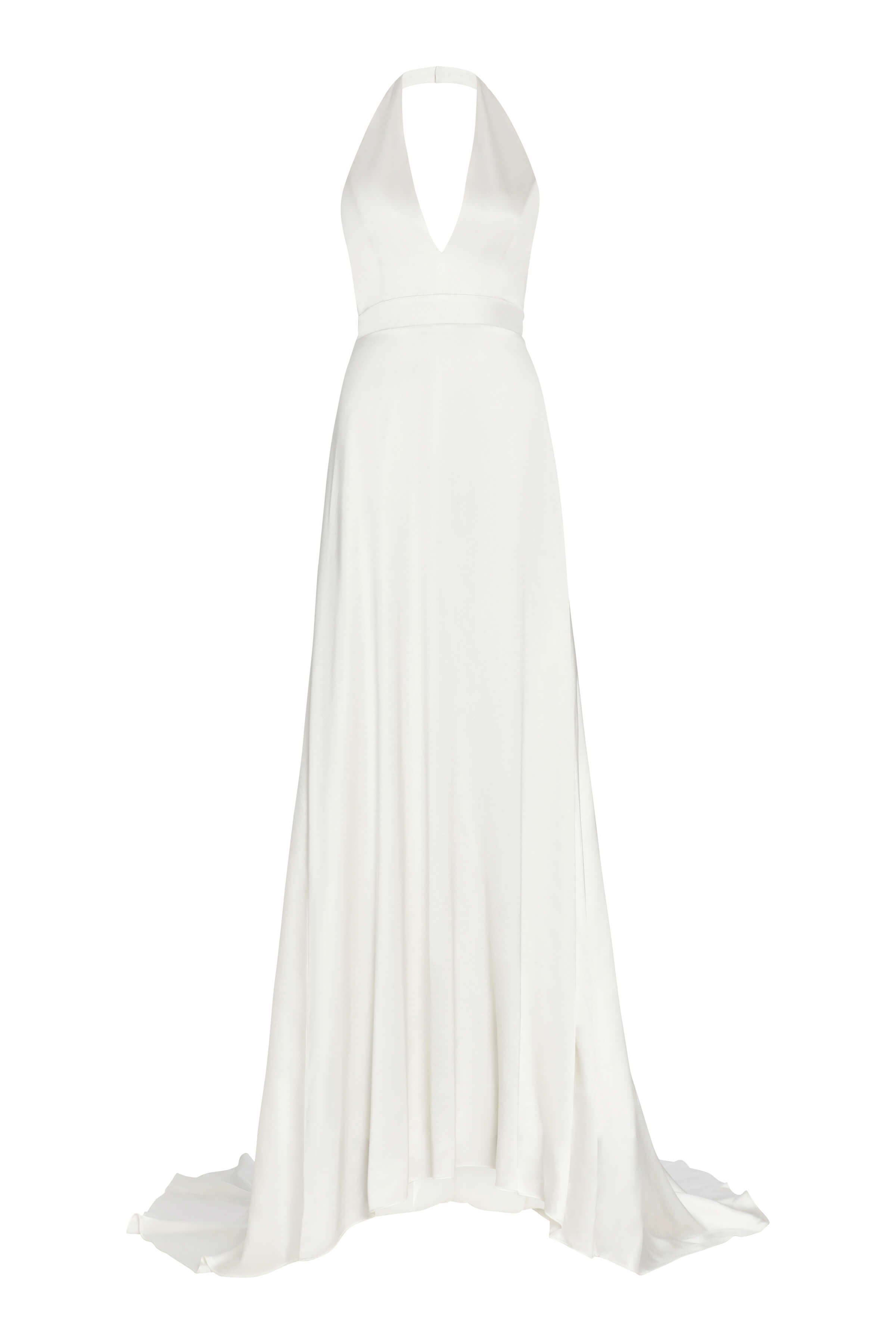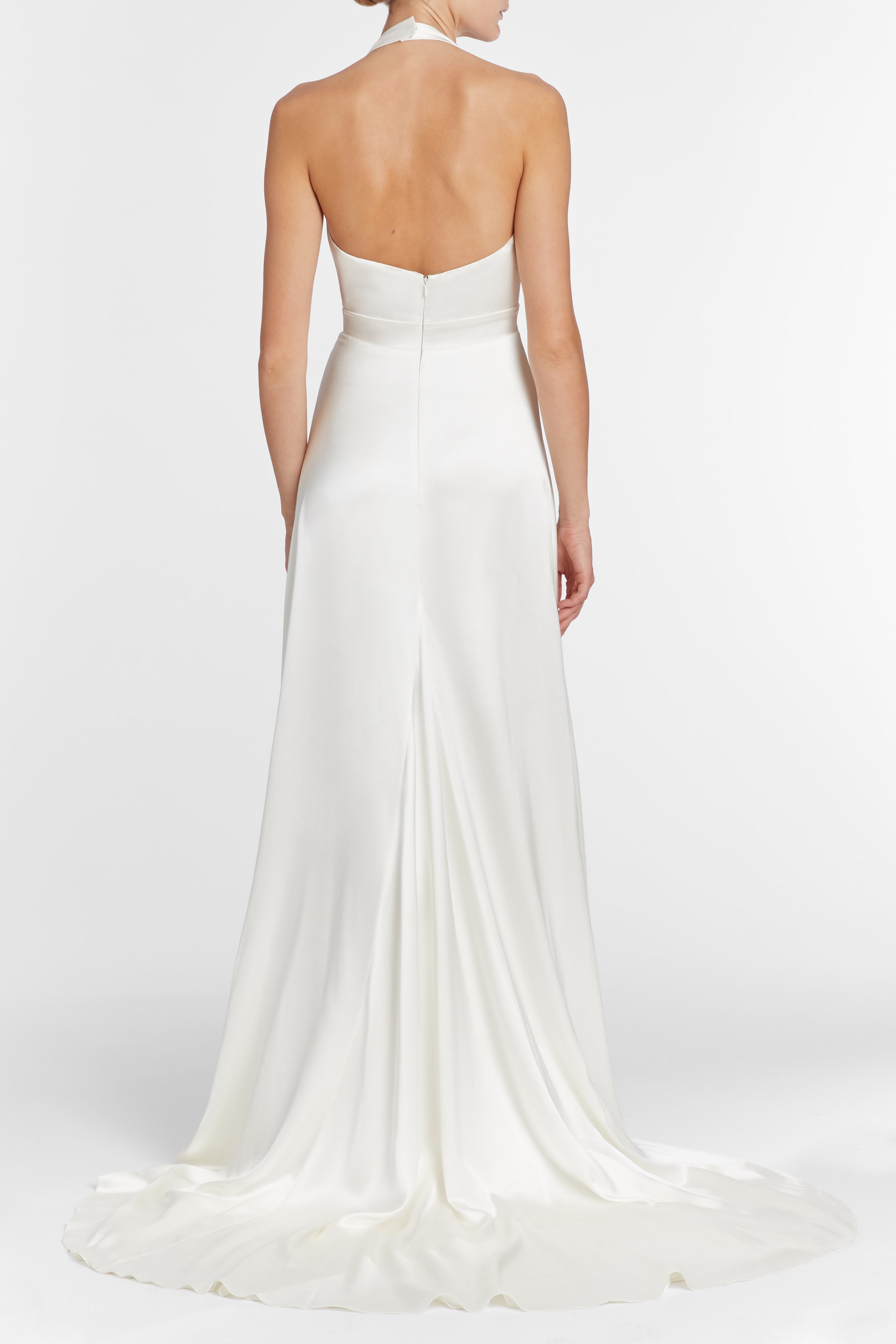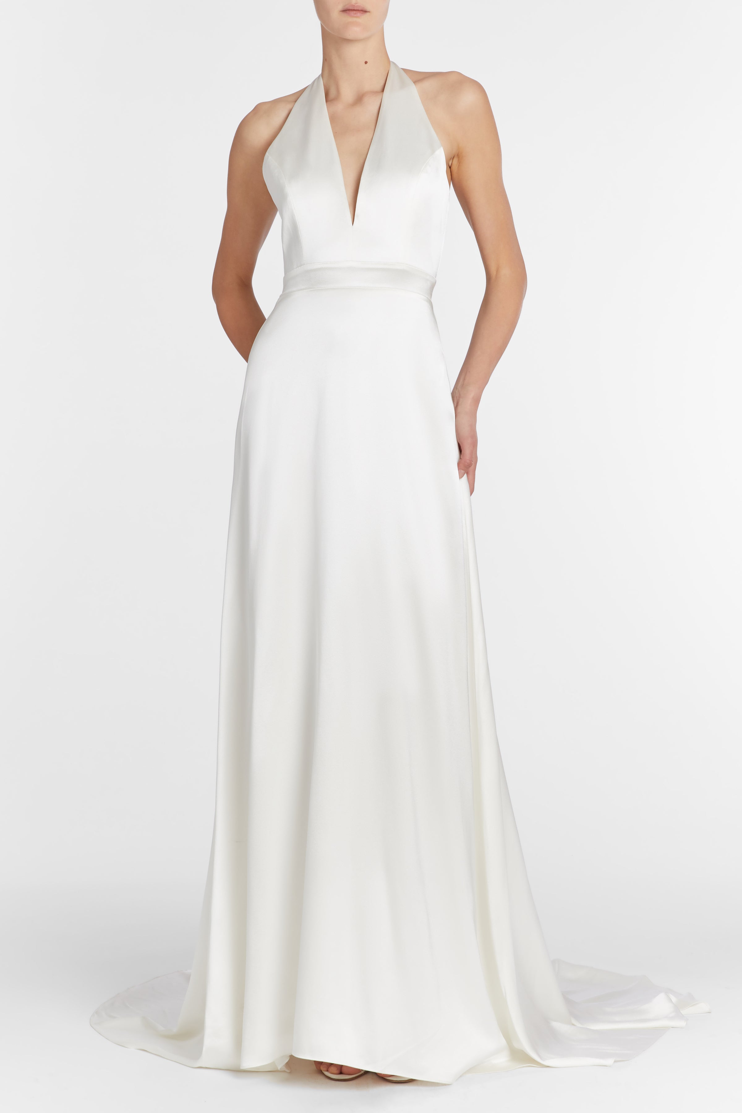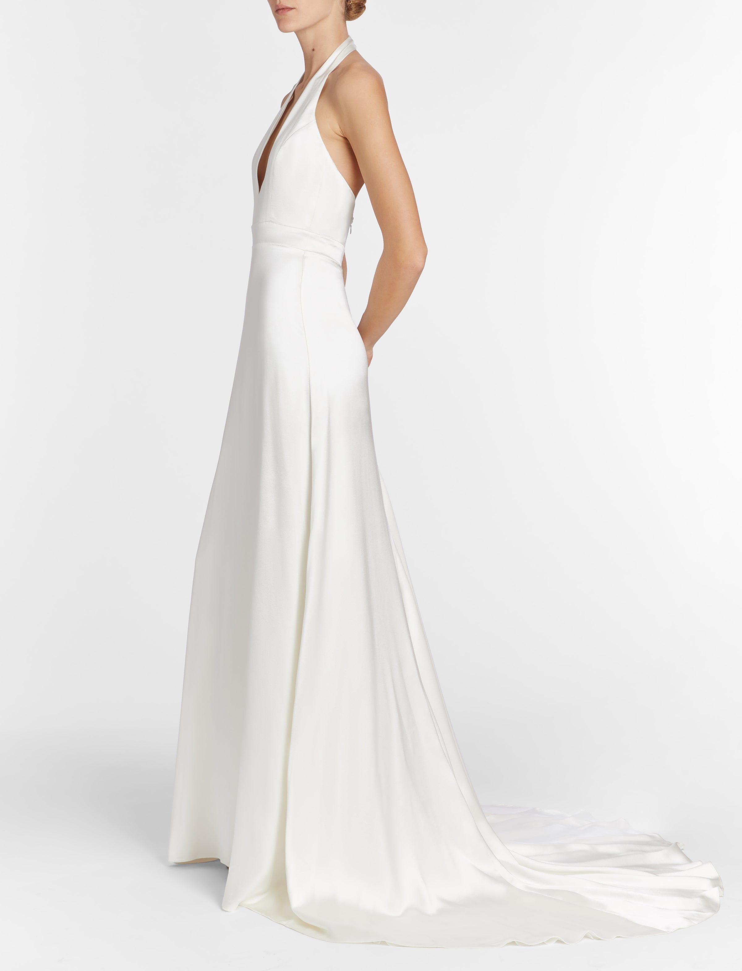 White silk v-neck halter gown with puddle train