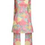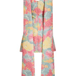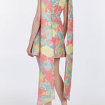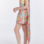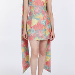 - Sherbert floral brocade a-line silhouette mini dress with scooped neckline and matching shoulder bows, fully lined