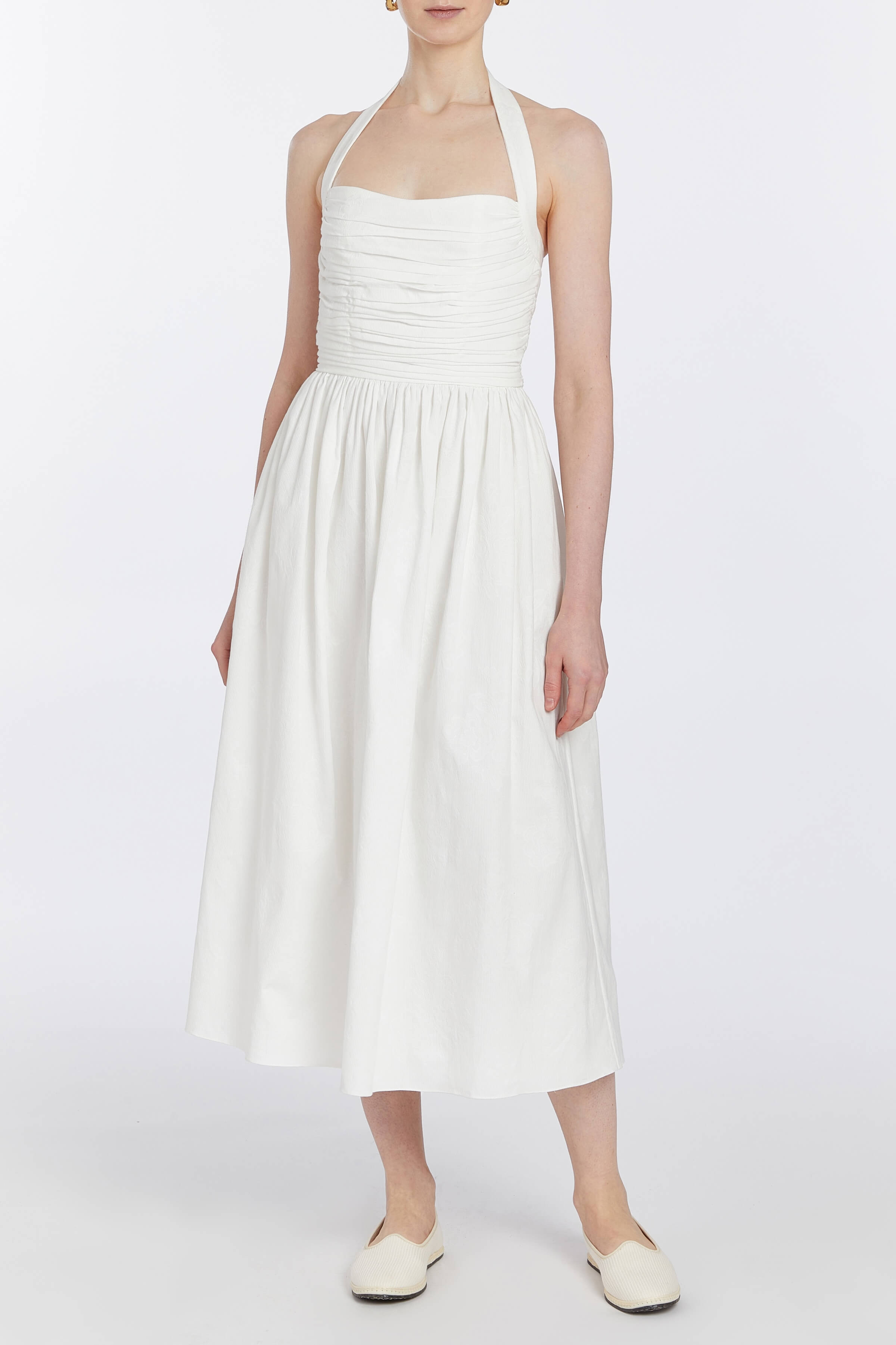 Off-white floral striped cotton jacquard with halter neck, ruched bodice and full skirt, fully lined