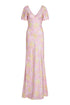 - Pink and yellow printed floral satin puff sleeve v-neck gown with v-back, fully lined