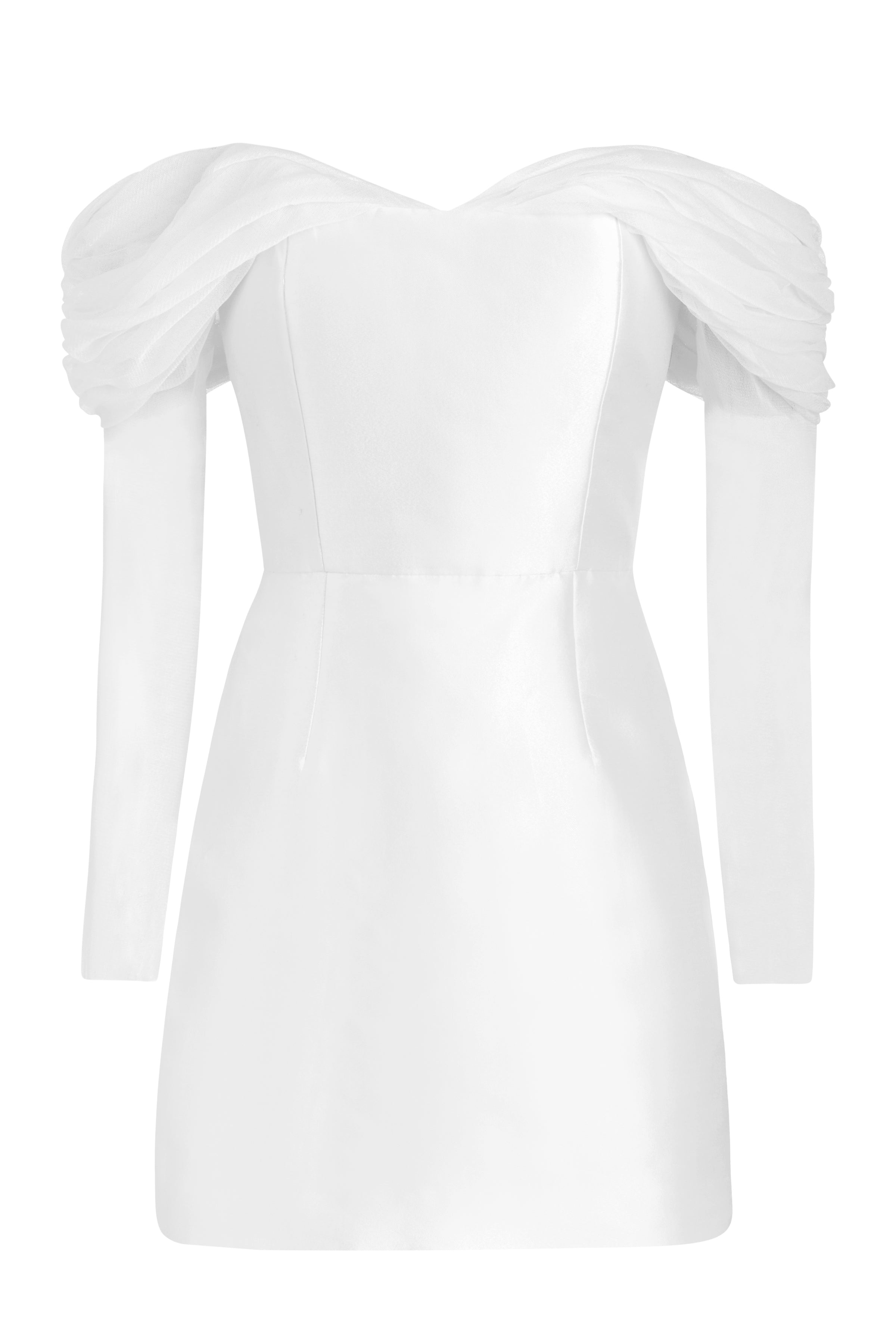 - White mini dress featuring silk tulle draped neckline drape and long sleeves
