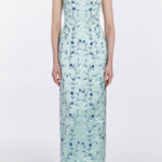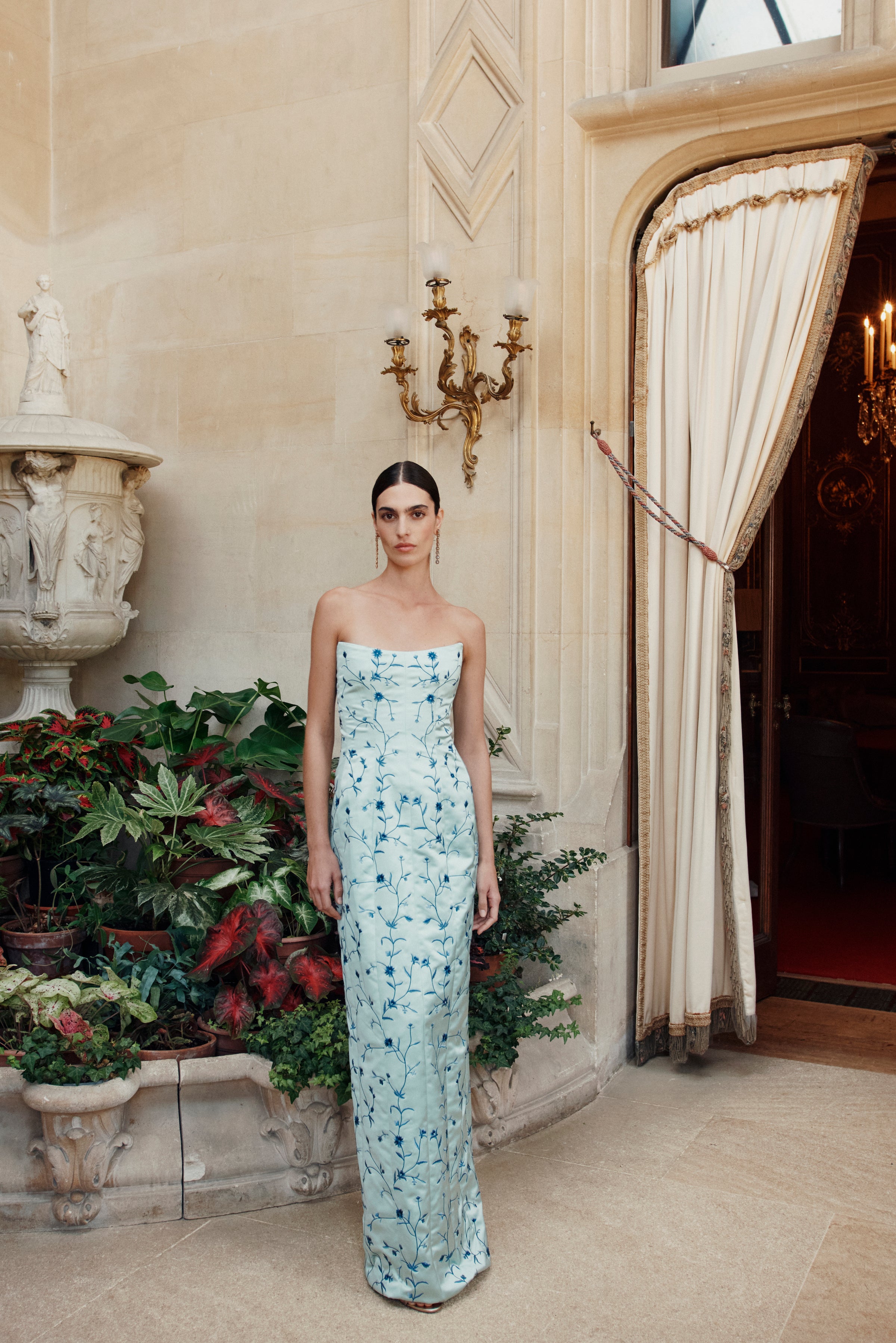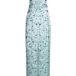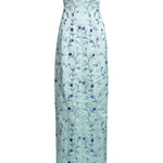 • Mint vine embroidered silk strapless column gown with back slit, fully lined
