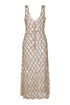 - Seashell and silver bead embellished nude mesh v-neck sleeveless midi dress, unlined
