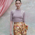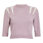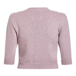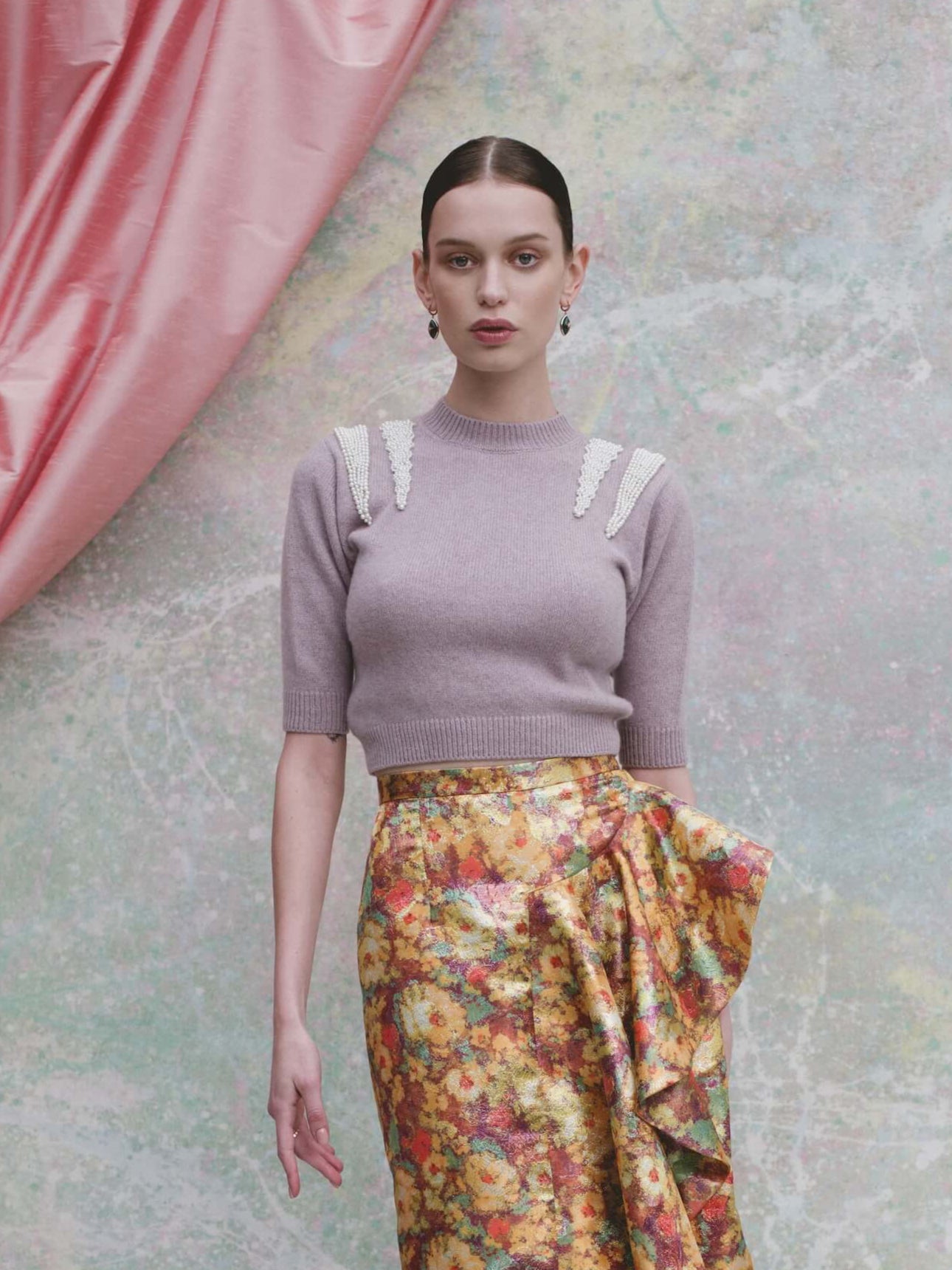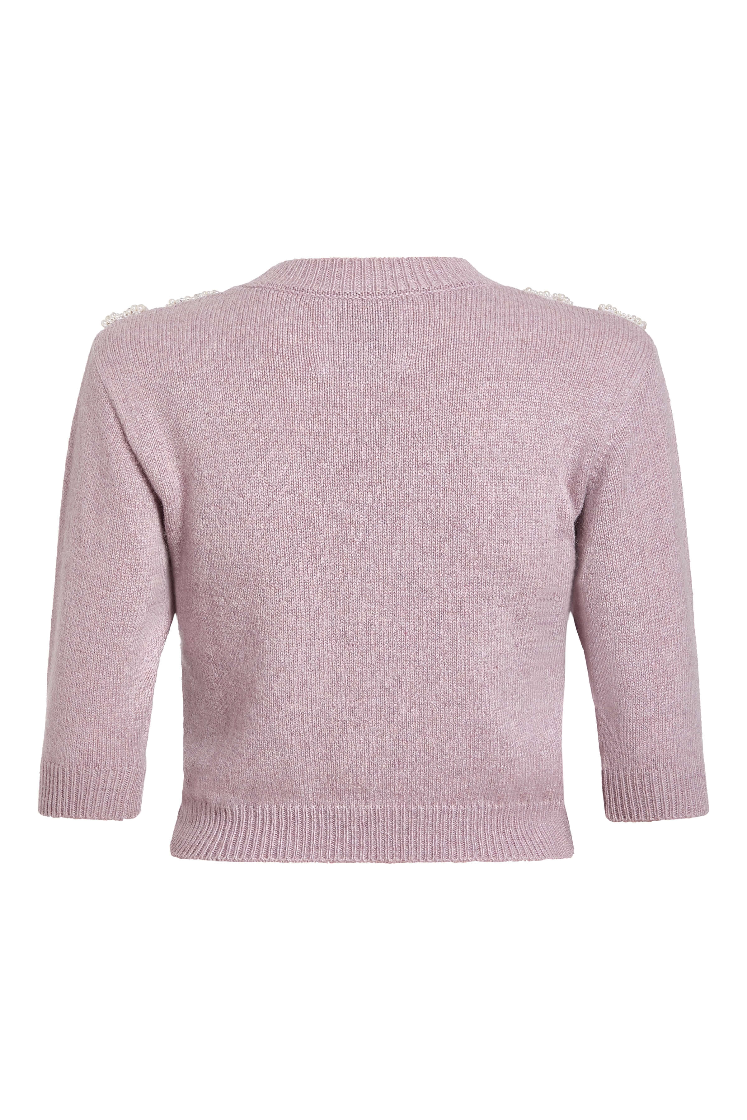 - Short sleeve Italian cashmere crewneck sweater with hand beaded pearl patches, unlined