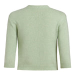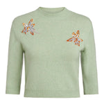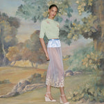 The Posy Pistachio Sweater With Floral Beaded Patches is styled with our Amoret Ice Blue Satin and Tulle Skirt