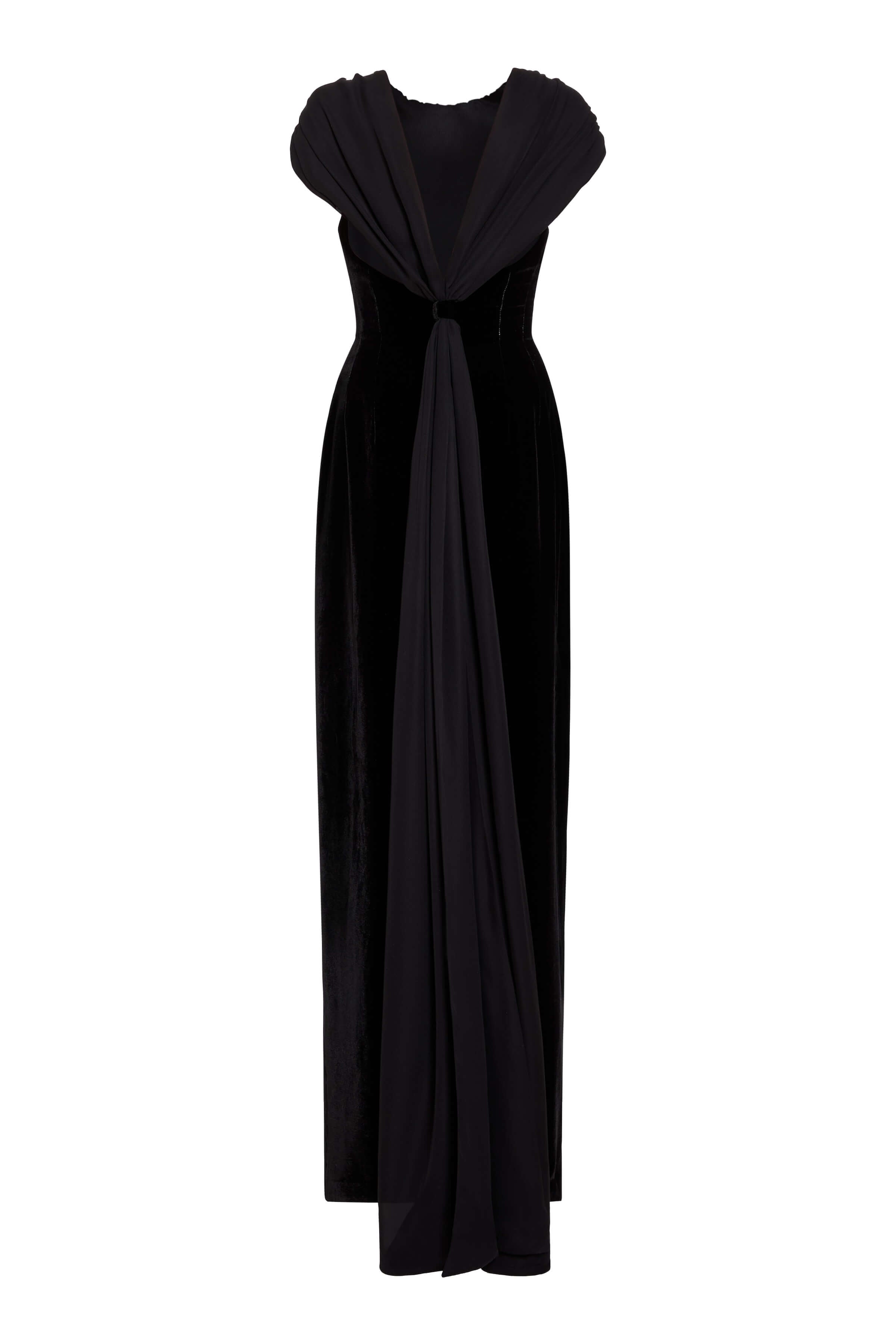 - Corseted bodice straight skirt gown with silk georgette shawl and train, fully lined