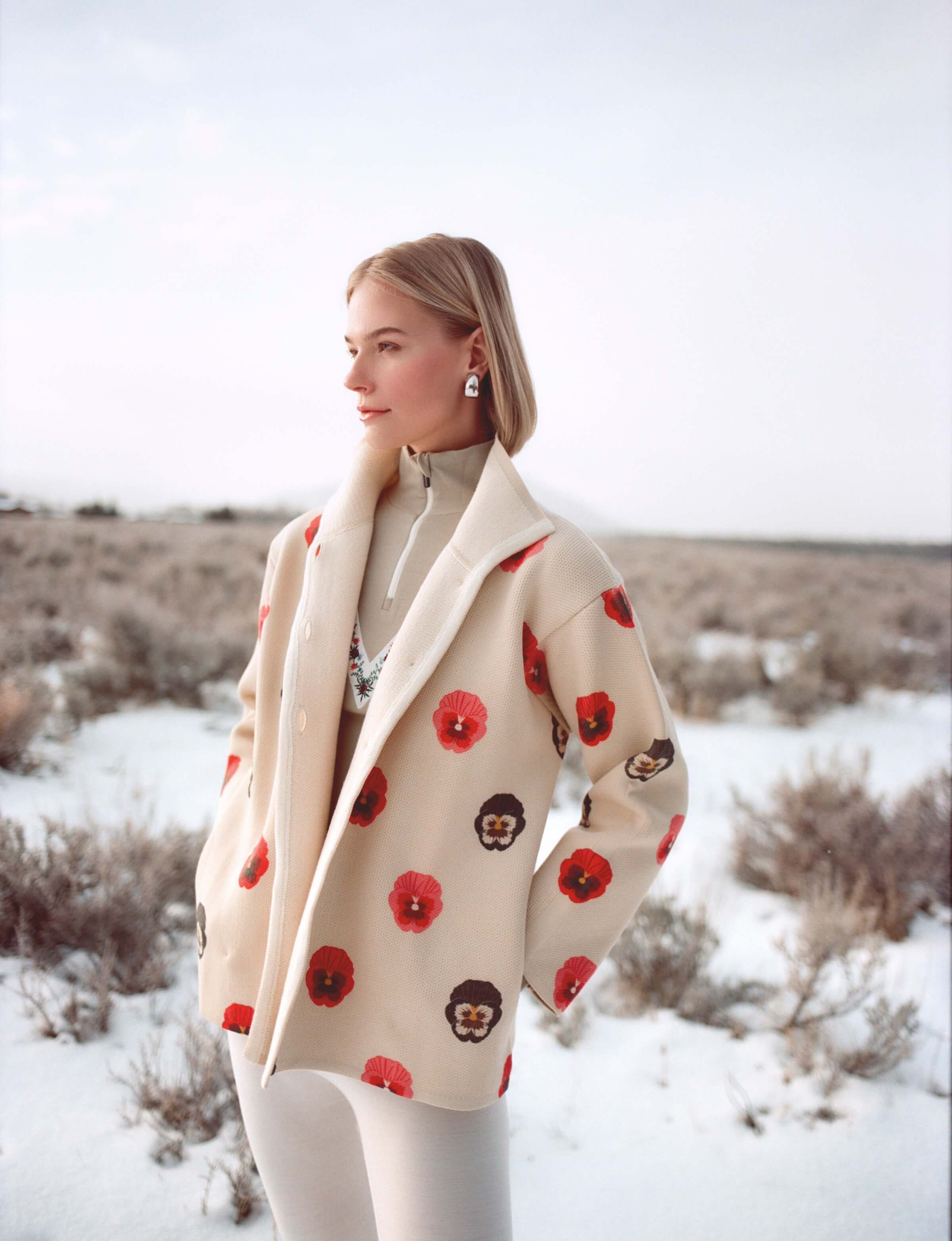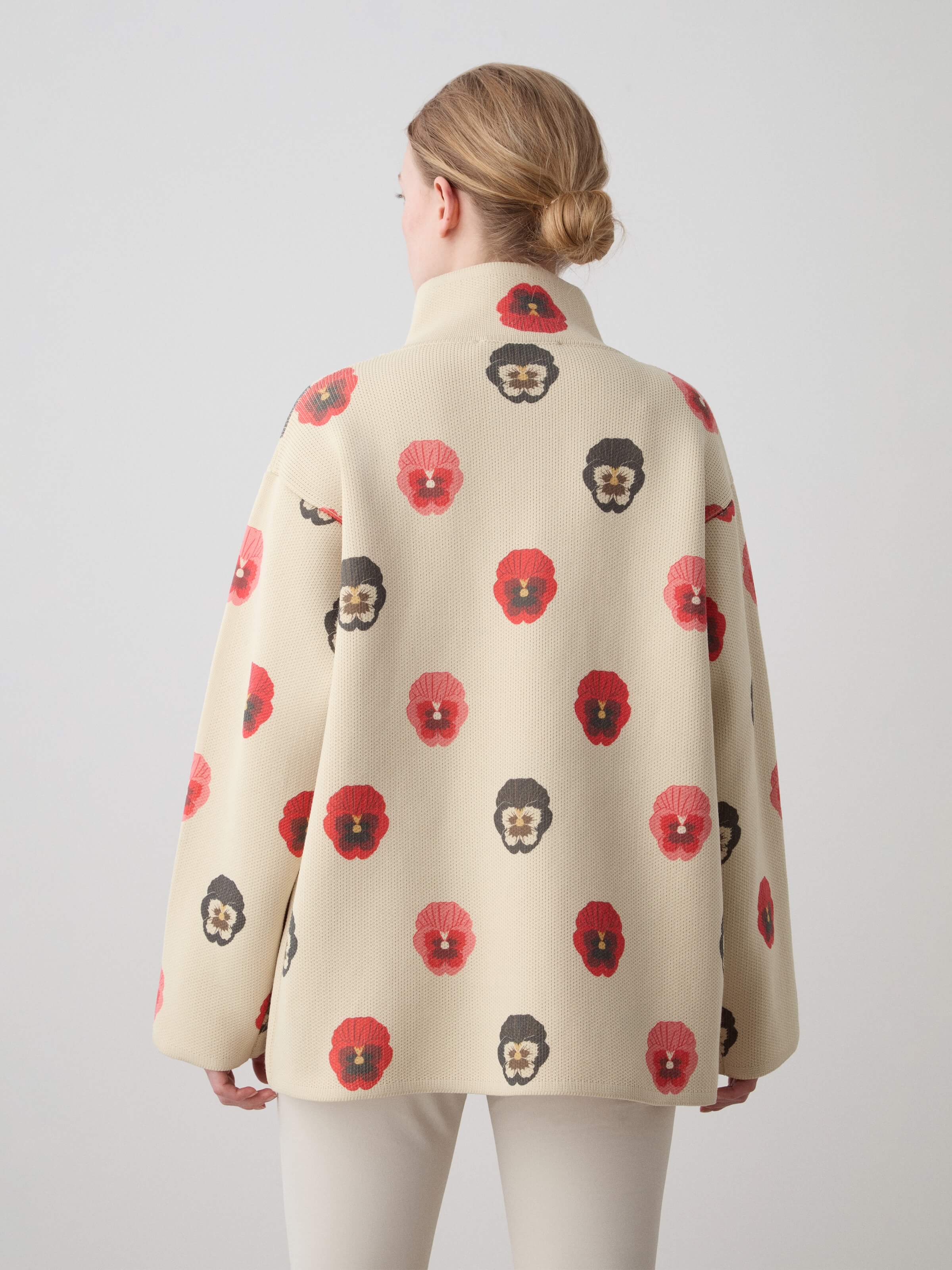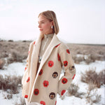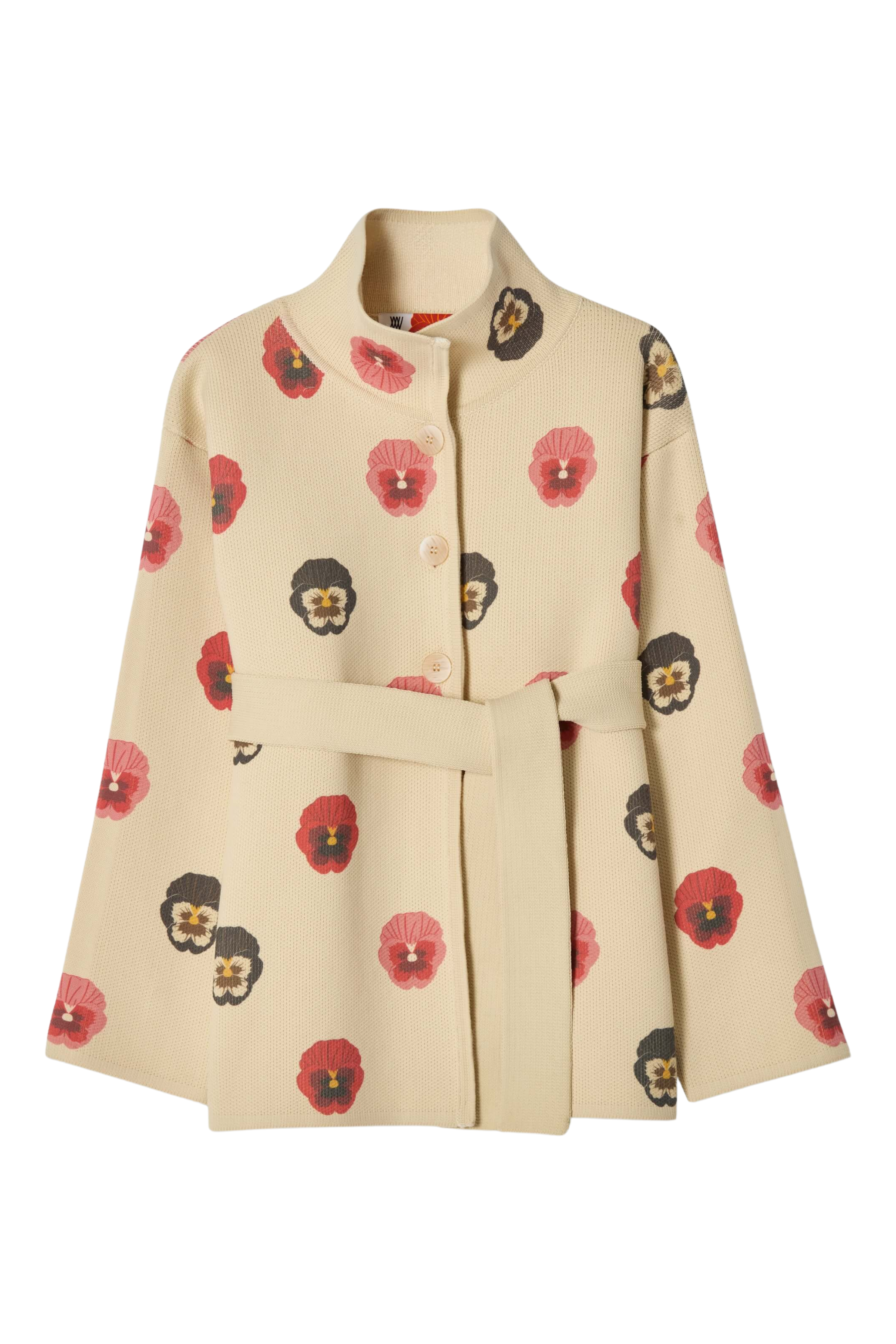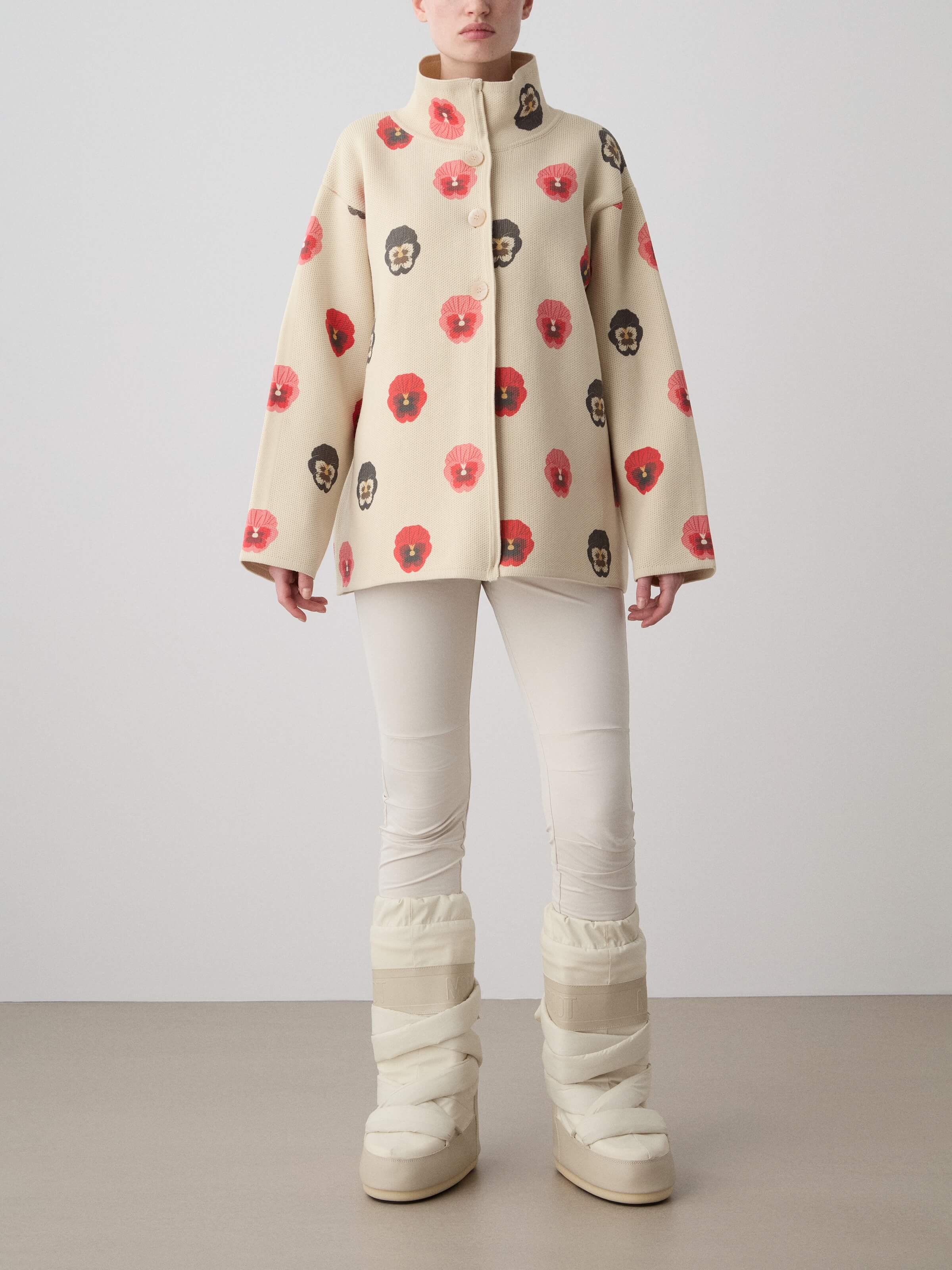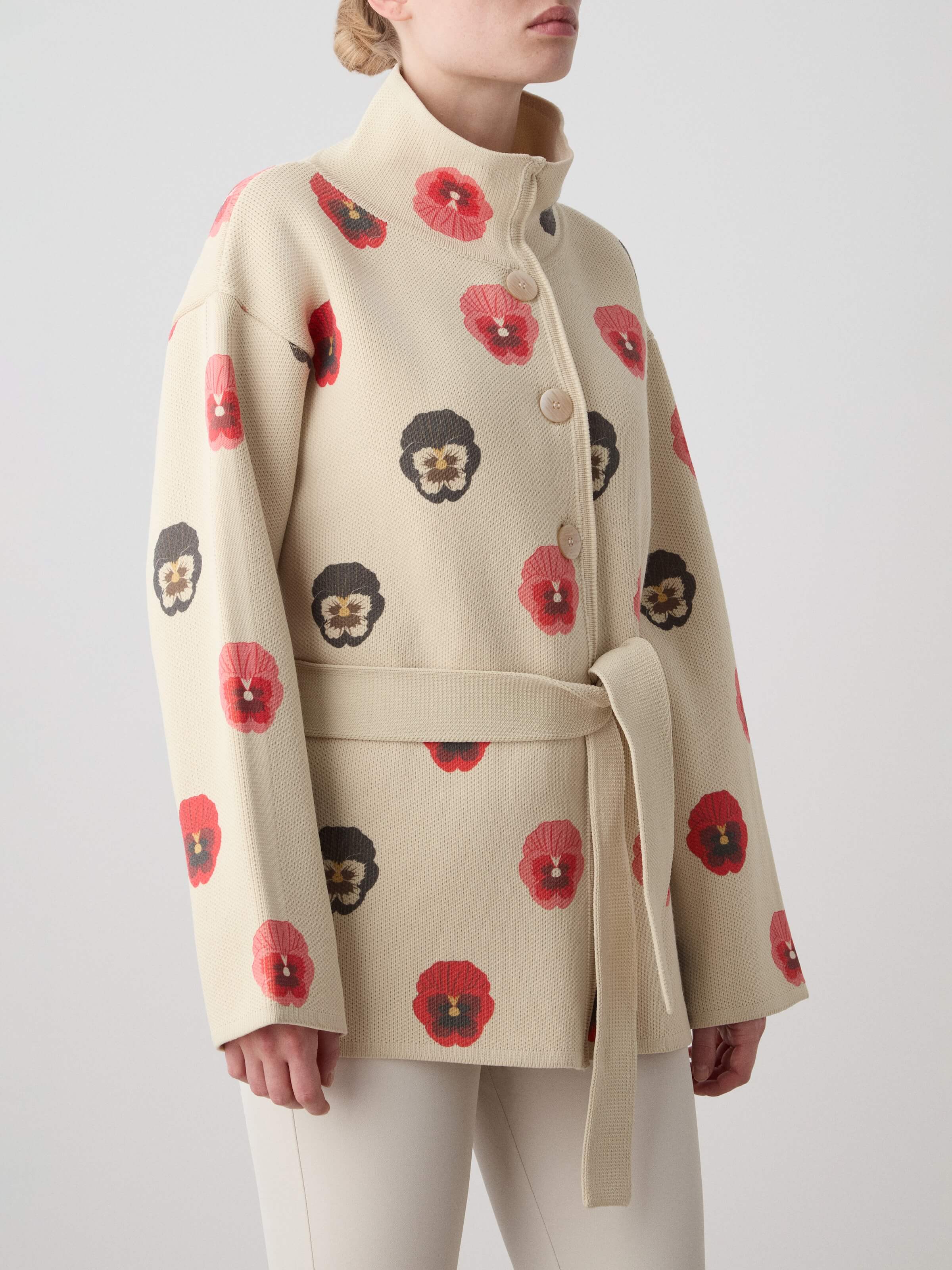 This jacket is crafted from a high-quality wool yarn, with a nylon face side that has been digitally printed for a unique and modern touch. The knit is dense yet lightweight, offering both structure and comfort. The jacket is complemented by a matching belt, knitted from the same yarn and featuring the same striking print. It features a slightly overlapped front, fastened with elegant buttons for a refined finish. Each piece is individually numbered, making it a distinctive item in this exclusive limited edition collection.